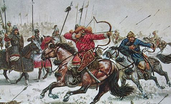 В 214г. Цинь Ши-хуанди отправил на север полководца Мэнь Тяня с огромным войском. Войска перешли Желтую реку и заняли предгорья Иньшаня. Хунны потеряли лучшие земли в горах, «привольные лесом и травою, изобилующие птицей и зверем», где они могли заготовлять луки и стрелы, и откуда было легко совершать набеги. В это время хунны уже имели шаньюя, который был, как можно думать, не абсолютным монархом, но постоянным, даже пожизненным, вождем. Незадачливый хуннский шаньюй Тумань вместе со своим народом откочевал в Халху, спасаясь от копий китайской пехоты в просторах пустыни Шамо. Но даже там для обеспечения покоя ему пришлось отдать в заложники своим соседям юэчжам старшего сына Модэ. Казалось, что с хуннами покончено и что их соседи разделят между собой степи. Но история судила иначе!