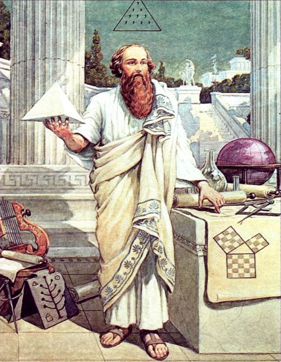 Пифагор (580-500 г до н.э.) утверждал, что познать мир – это значит познать управляющие им Числа. Он считал их самостоятельными Принципами, лежащими в основе мироздания. Каждому числу соответствует своя философская категория и своя геометрическая фигура: точка, линия, треугольник (поверхность) и пирамида (тело).